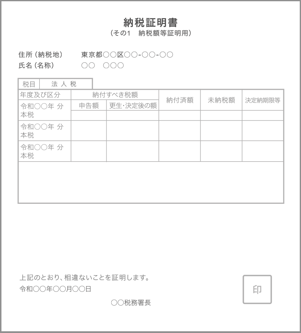 必要部数 1部(納税証明書その1) 注意事項 法人税または事業税の証明書が必要となります。 -