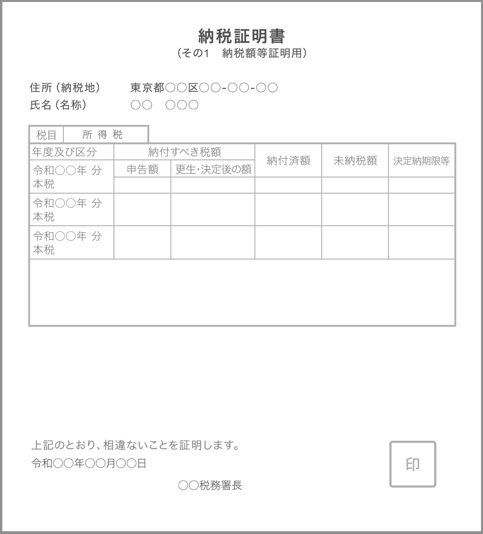 必要部数 1部(納税証明書その1) 注意事項 所得税または事業税の証明書、どちらの証明書も添付できない場合は、事業による所得割のある住民税の証明書が必要です。 -