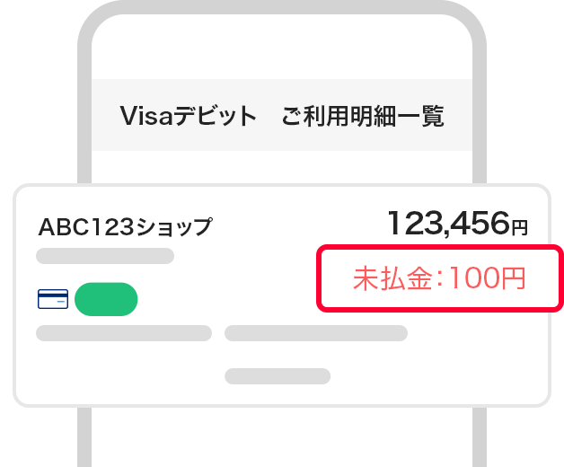 - 購入キャンセルによる未払金発生の場合、ご入金いただかなくとも、最終的な返金データが到着することで解消しますが、その間Visaデビットは利用できません。