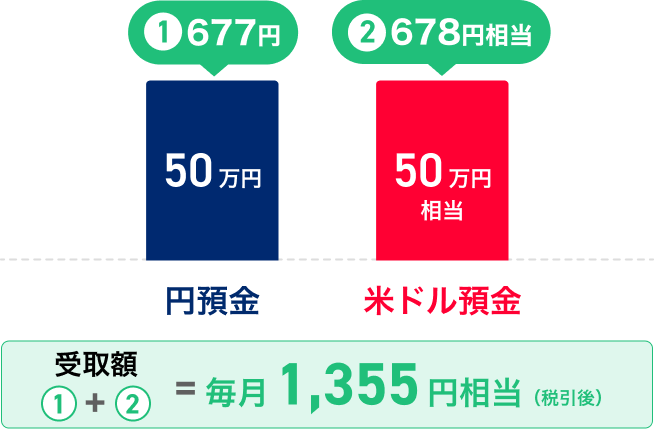 - 例1 円預金・米ドル預金に50万円ずつ預け入れした場合